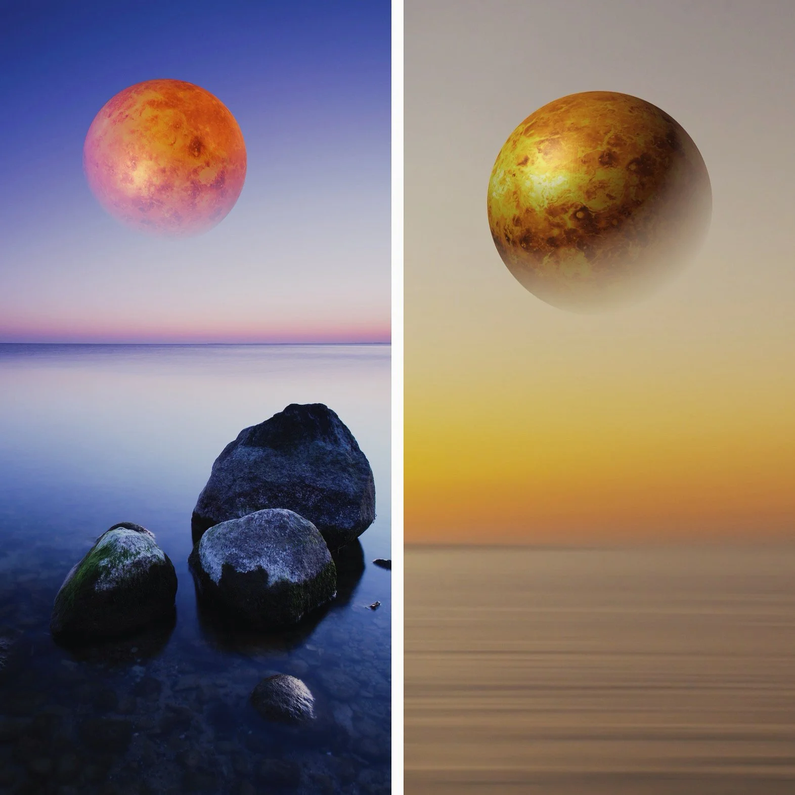 Above Images: Photographic Lightbox works Left: Morning Star 5, 2024 Right: Morning Star 4, 2024, XR sculpture, Carnelian quartz, Venus, sound (source NASA), atmoshpere, extended reality [30m x 30m x 50m]