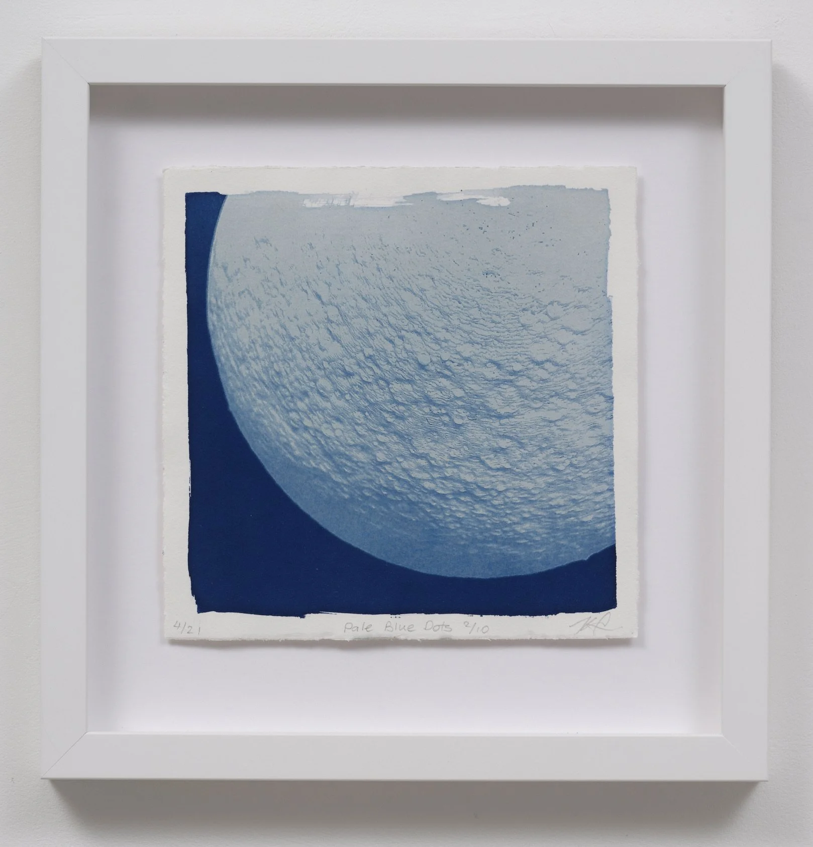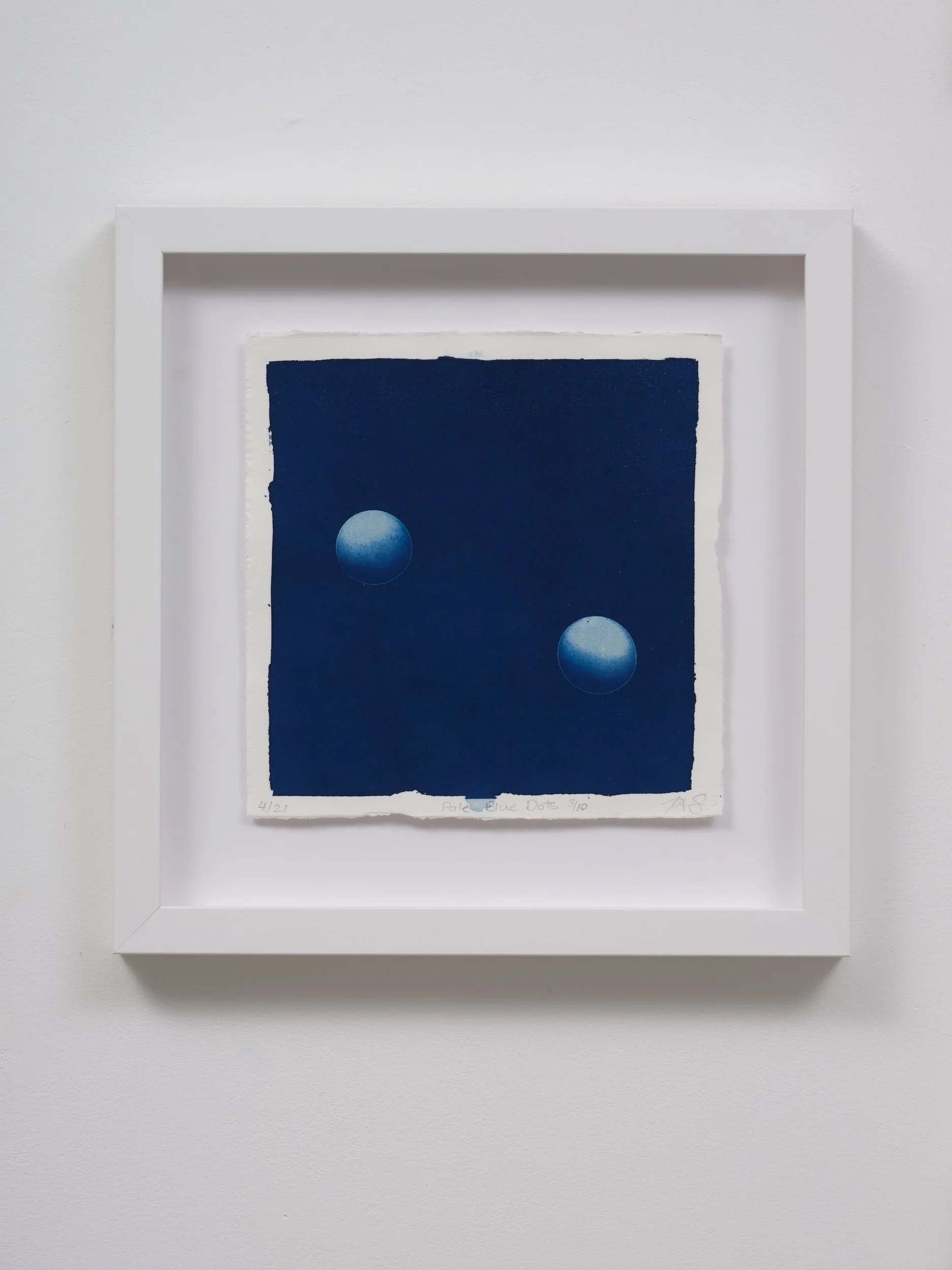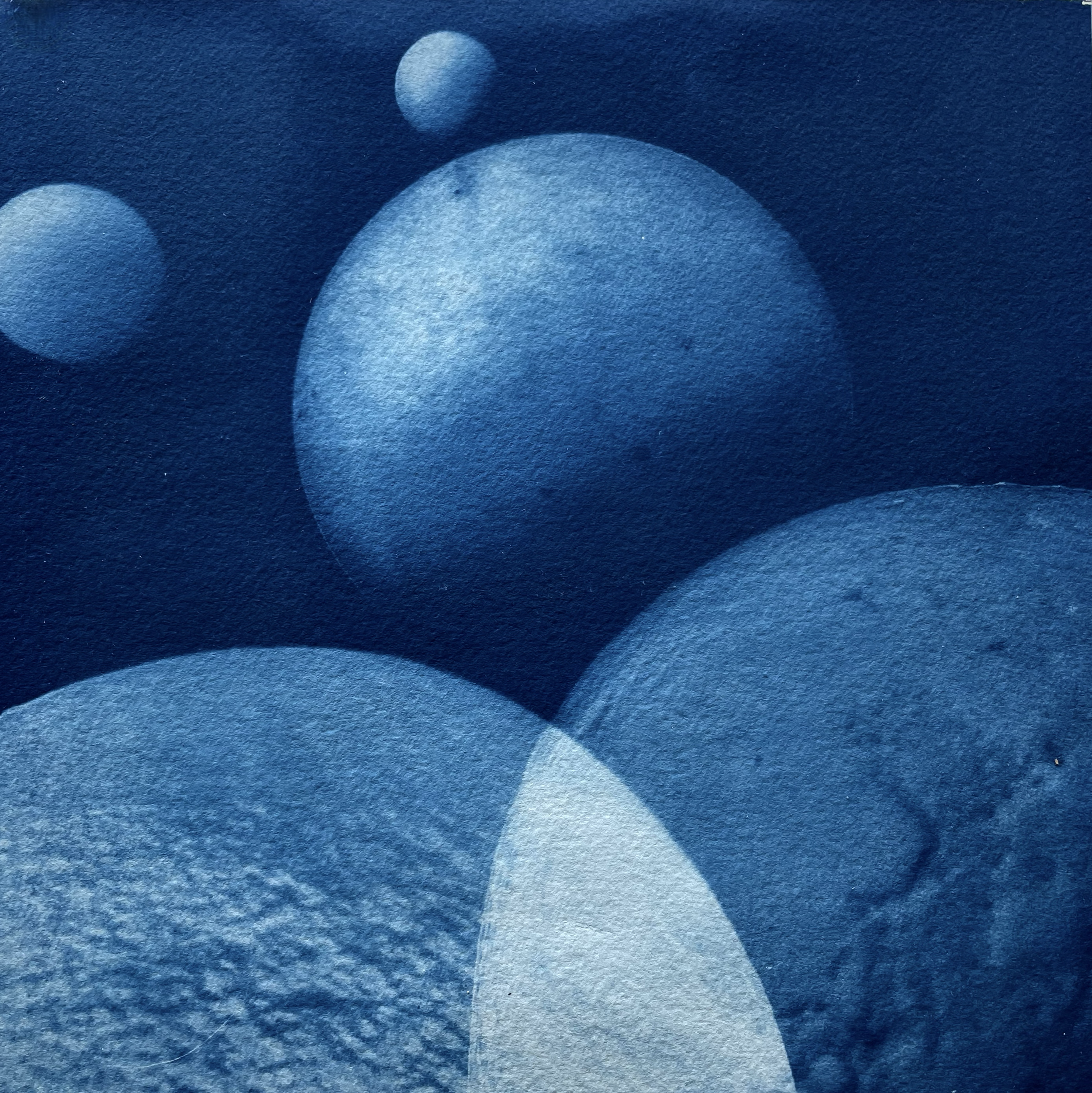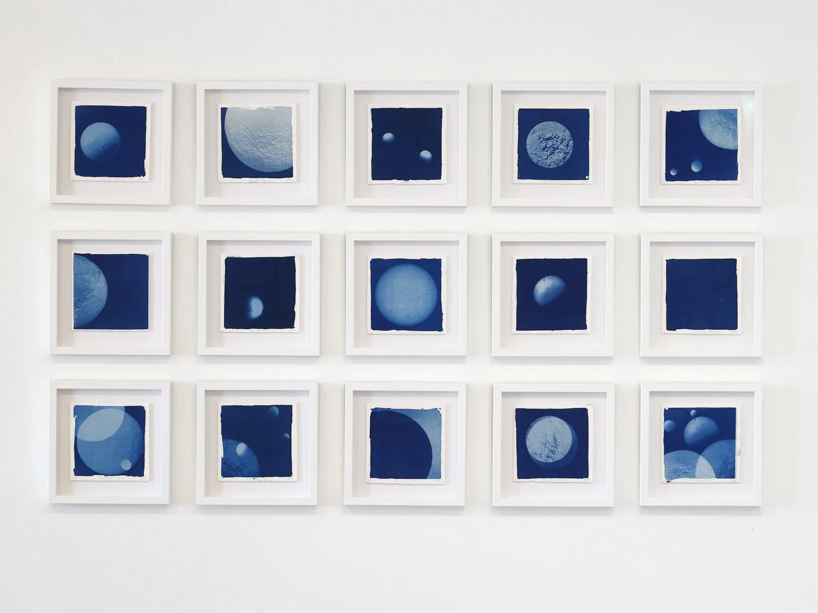 Using one of photography’s earliest processes, these works harness sunlight to create deep Prussian blue fields. Everyday forms are placed directly onto light-sensitive paper, leaving behind luminous silhouettes and shifting constellations. The resulting images echo both natural cycles and cosmic mappings, where the simplest of materials become radiant traces of light and time.